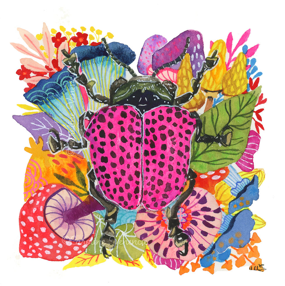 Aquarelle originale 13 x 13 cm - Le doryphore rose à pois